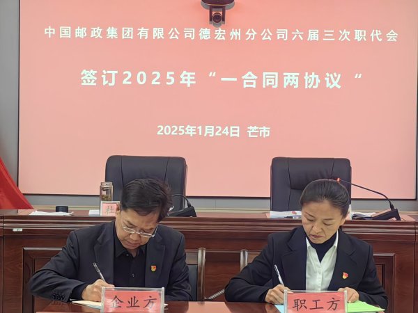 大會總結(jié)2024年工作,部署2025年任務(wù),會議聽取了州分公司黨委書記、總經(jīng)理杜國祥所作的題為“攻堅克難勇?lián)?dāng)增強(qiáng)能力提質(zhì)效持續(xù)推動德宏郵政高質(zhì)量發(fā)展”的行政工作報告和州郵政工會主席段春燕作的題為“夯基礎(chǔ) 強(qiáng)服務(wù)勇?lián)?dāng) 凝心聚力為德宏郵政高質(zhì)量發(fā)展貢獻(xiàn)力量”的工會工作報告。大會通過了職代會四個專門委員會的工作報告和2024年“一合同兩協(xié)議”履行情況報告,以及工代會的工會財務(wù)、女工委、經(jīng)審工作報告,職工代表對州分公司領(lǐng)導(dǎo)班子及成員進(jìn)行了民主評議,企業(yè)與工會簽訂了2025年《中國郵政集團(tuán)有限公司德宏州分公司集體合同》《中國郵政集團(tuán)有限公司德宏州分公司工資集體協(xié)商專項協(xié)議》《中國郵政集團(tuán)有限公司德宏州分公司女職工特殊保護(hù)專項協(xié)議》。