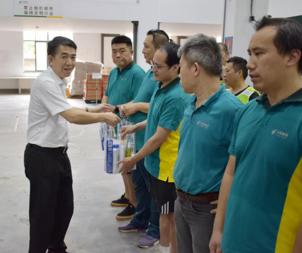 7月22日上午,在盛夏的七月,烈日炎炎,市分公司副總經(jīng)理徐永淼、寄遞事業(yè)部服務(wù)質(zhì)量部顧斌一行赴國際業(yè)務(wù)分公司大宗營業(yè)部開展高溫慰問,向奮戰(zhàn)在高溫下的工作者們送去絲絲涼意與深切關(guān)懷。