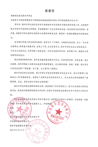 9月4日,河南省輝縣市郵政分公司收到了新鄉(xiāng)市碧桂園房地產(chǎn)開發(fā)有限公司、河南錦華置業(yè)有限公司、輝縣市誠海置業(yè)有限公司聯(lián)合發(fā)來的一封感謝信和一面鮮艷的錦旗。在感謝信中,客戶對該分公司攬投員路步開及郵政專業(yè)的寄遞服務(wù)與高效保障措施給予了稱贊。