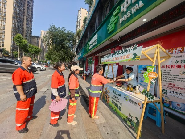 8月15日,榮昌郵政工會組織開展“郵愛驛站送清涼,真情服務(wù)暖人心”活動??偨?jīng)理朱軍帶隊為環(huán)衛(wèi)工、快遞員、外賣人員、交巡警等戶外勞動者送去防暑物資,用實(shí)際行動為酷暑中的堅守者撐起 “遮陽傘”。