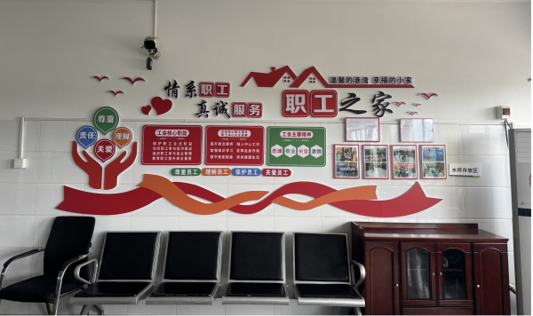 四是立足特色,堅持元素凸顯“有歸屬”。在“陣地”上將工會標(biāo)識懸掛外墻,強化“家”的辨識度和職工的歸屬感。內(nèi)部精心設(shè)計的宣傳展示板(政策文件、集體榮譽、職工風(fēng)采、文明公約)以及滾動播放工會宣傳片、培訓(xùn)課程、勞模工匠事跡、政策解讀的移動電視,在空間營造“有歸屬”方面凸顯工會元素,展現(xiàn)了濃厚的企業(yè)文化氛圍,讓職工直觀感受到“家”的精神內(nèi)核和工會作為,增強了認(rèn)同感。