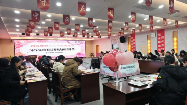 3月6日下午,宋錦珍珠拼貼畫制作活動(dòng)率先拉開帷幕,60多名女職工齊聚一堂,開啟了一場(chǎng)兼具美感、治愈感與手工樂趣的非遺體驗(yàn)之旅。宋錦,作為中國“四大名錦”之一,其紋樣精致、色彩典雅,承載著千年非遺的深厚底蘊(yùn);珍珠的瑩潤光澤與宋錦的雅致紋理交相輝映,碰撞出獨(dú)特的藝術(shù)火花。女職工們從設(shè)計(jì)構(gòu)圖開始,小心翼翼地用鑷子將一顆顆小巧的珍珠,依循畫稿黏合在精美的宋錦底布上,整個(gè)過程寧靜而溫馨,大家相互交流技巧、彼此鼓勵(lì)打氣,在專注創(chuàng)作中釋放工作壓力。歷經(jīng)兩個(gè)多小時(shí)的精心雕琢,一幅幅獨(dú)具匠心的宋錦珍珠拼貼畫漸次成型,每一幅作品皆傾注了女職工的巧思與心血,不僅讓大家領(lǐng)略到傳統(tǒng)非遺工藝的獨(dú)特魅力,更在親自動(dòng)手實(shí)踐中收獲了滿滿的成就感與幸福感,陶冶了情操,愉悅了身心。