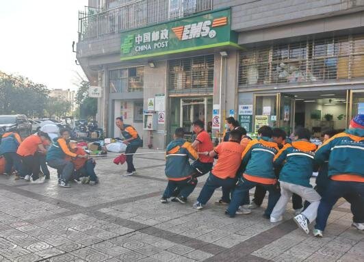 本次春日活力賽設(shè)置了EMS信封接力與力拔山河拔河兩大特色項(xiàng)目,既貼合郵政工作場(chǎng)景,又充滿競(jìng)技趣味。在EMS信封接力環(huán)節(jié),職工們手持EMS信封,沿著指定路線快速折返傳遞,大家步伐矯健、配合默契,在保證道具平穩(wěn)傳遞的同時(shí),拼速度、比協(xié)作,充分展現(xiàn)了郵政人高效利落的工作作風(fēng);拔河比賽更是將現(xiàn)場(chǎng)氛圍推向高潮,隨著哨聲響起,兩組隊(duì)員緊握長(zhǎng)繩、重心后傾,“一二、一二”的號(hào)子聲鏗鏘有力,場(chǎng)外職工自發(fā)組成啦啦隊(duì),吶喊助威聲此起彼伏,大家心往一處想、勁往一處使,在拉鋸比拼中凝聚起強(qiáng)大的團(tuán)隊(duì)合力。